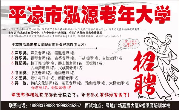 2018-03-27“一年之計在于春”,在這個陽光明媚,桃花盛開的季節(jié)里,經(jīng)過培訓(xùn)學(xué)校全體工作人員不懈努力,由平?jīng)龉I(yè)園區(qū)泓源職業(yè)培訓(xùn)學(xué)校出資設(shè)立的平?jīng)鍪秀蠢夏攴?wù)中心(社區(qū)老年大學(xué))終于成立了!目前平?jīng)鍪秀蠢夏攴?wù)中心(社區(qū)老年大學(xué))已經(jīng)取得相關(guān)資質(zhì)證件,正在進(jìn)行